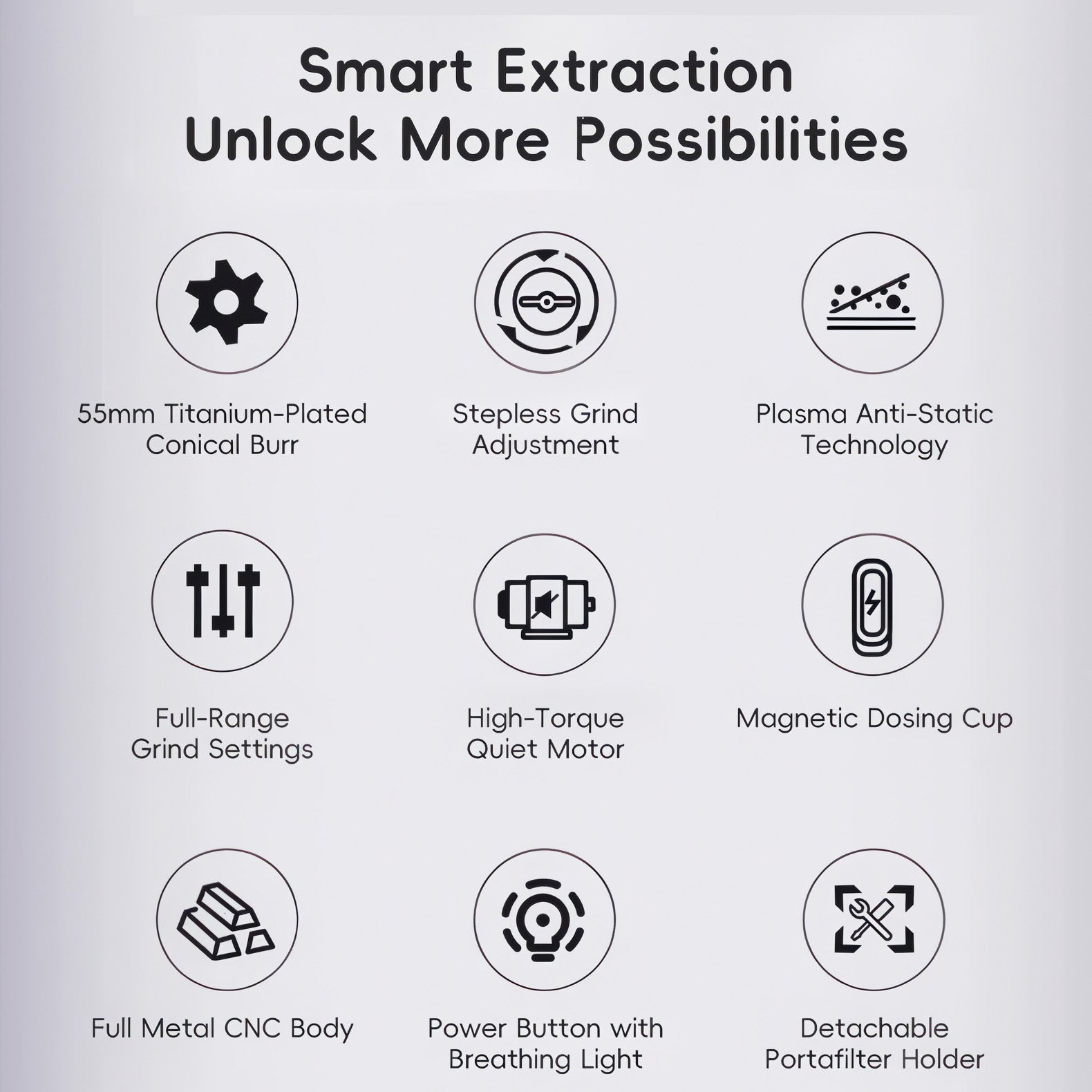 100-Step Stepless Grind Adjustment: 0.1mm precision for infinite fine-tuning across all brew methods.