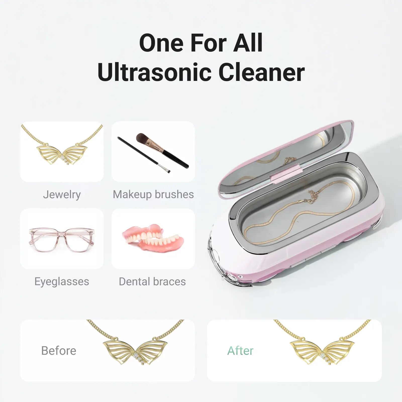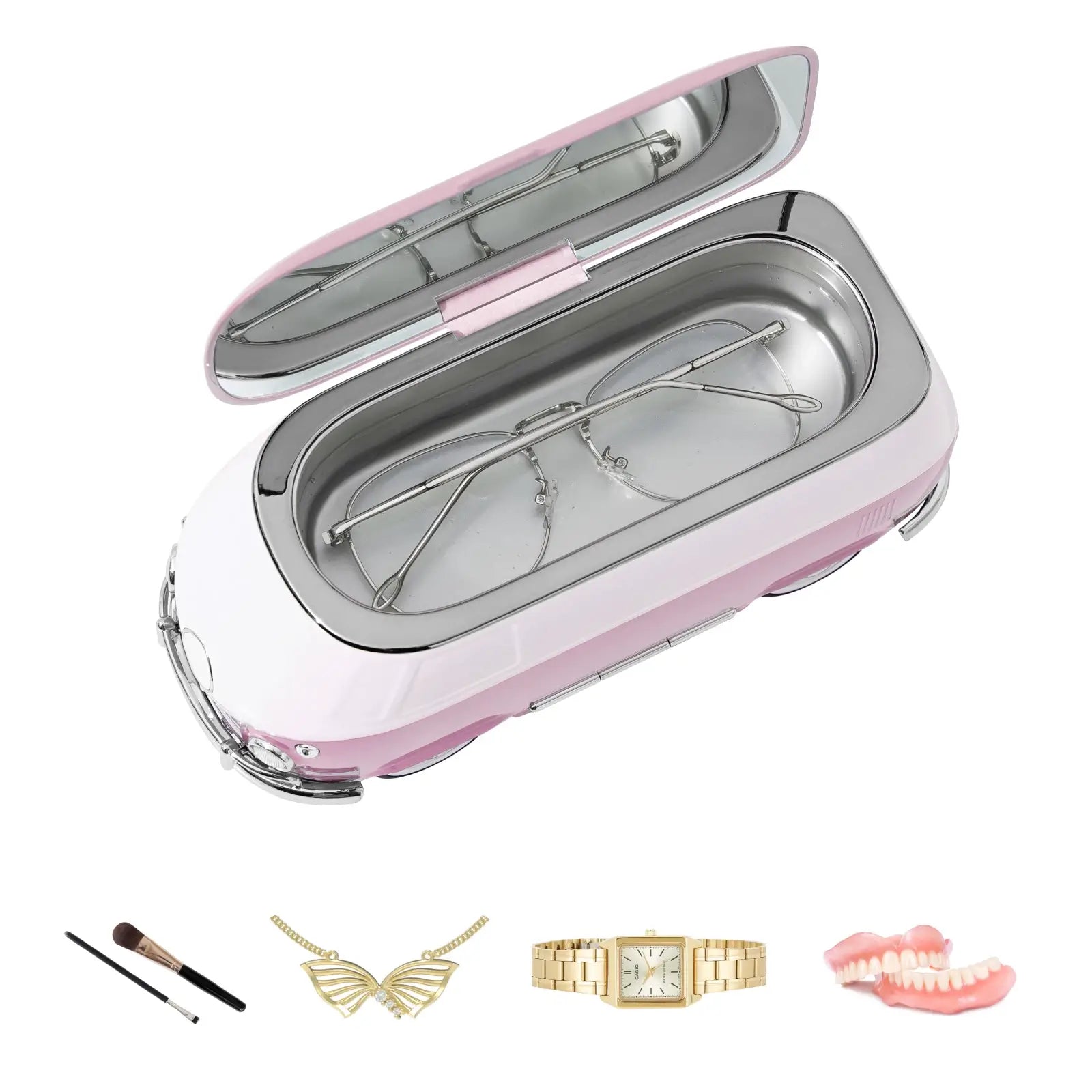 @Features Features Versatile: The ultrasonic cleaner is designed for jewelry, glasses, gold, dentures, makeup brushes, coins, and more. Perfect for eyeglasses shops, jewelry shops, clocks and watch shops, repair shops, dental clinics, office and household use. Powerful: Experience powerful 36W high-frequency cleaning at 45kHz for a thorough, yet gentle, 360° sonic cleanse that rejuvenates valuables without causing damage. Low-Noise: Experience a serene cleaning process with our low-noise ultrasonic cleaner, ensuring a comfortable and unobtrusive operation that won't disturb others around you. Simple: Simplify your cleaning routine with our ultrasonic cleaner solution offering 3 adjustable timers (1min for quick cleaning, 3mins for daily cleaning, 5mins for deep cleaning), providing easy, precise control for tailored cleaning experiences. Classic: Crafted with precision resembling a car model, our ultrasonic cleaner's classic bus design doubles as a stylish decorative piece. It effortlessly fits into any space with its compact size. |